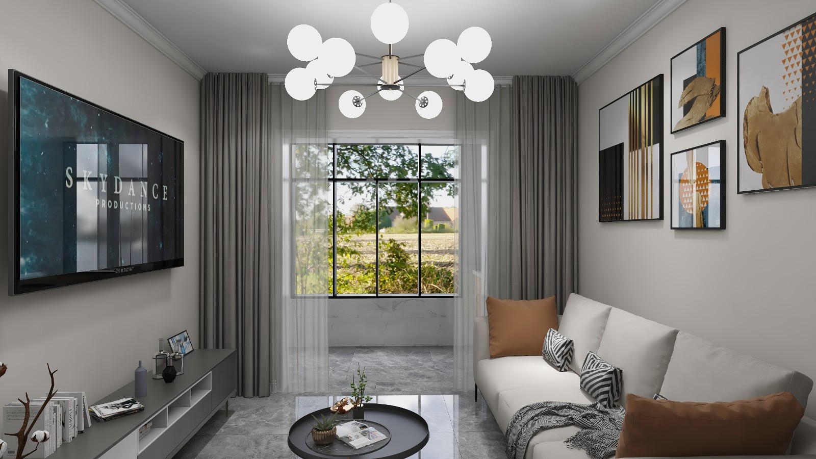 客厅简单大气,沙发背景挂了几幅装饰画