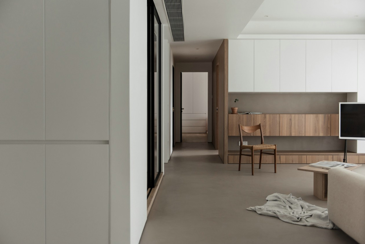 书房区域进行了抬高,平常可做为书房使用,偶尔来客可以在地台上铺上软垫,关上门拉上帘子,又是一个私密的空间,在这个空间中,整体上坚持“少即是多”的简约理念。