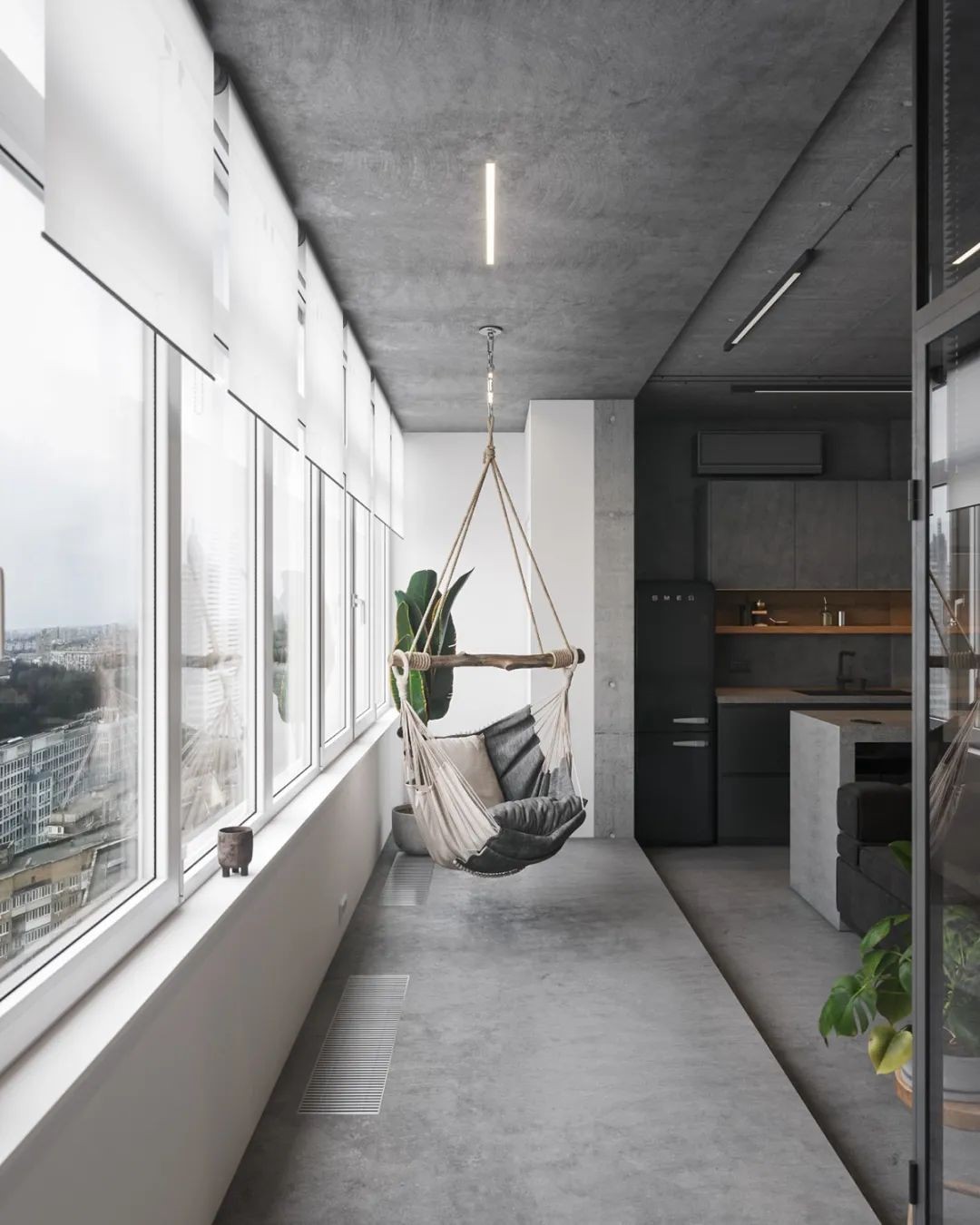 阳台升高的地板高度使其适合于单独的起居室,一个吊椅在自然日光波动,玻璃墙的卧室借用了客厅的光线,并增加了整个公寓的整体空间感