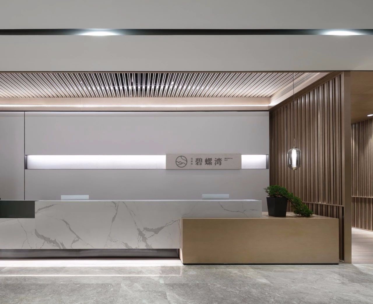 前台接待,爵士白背景墙,铝框装饰