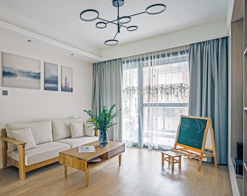 布艺沙发+原木桌椅+清新壁画,北欧与日系风格的完美结合,不落俗套。几株绿植点缀,生机盎然,好比一幅画里的点睛之笔。