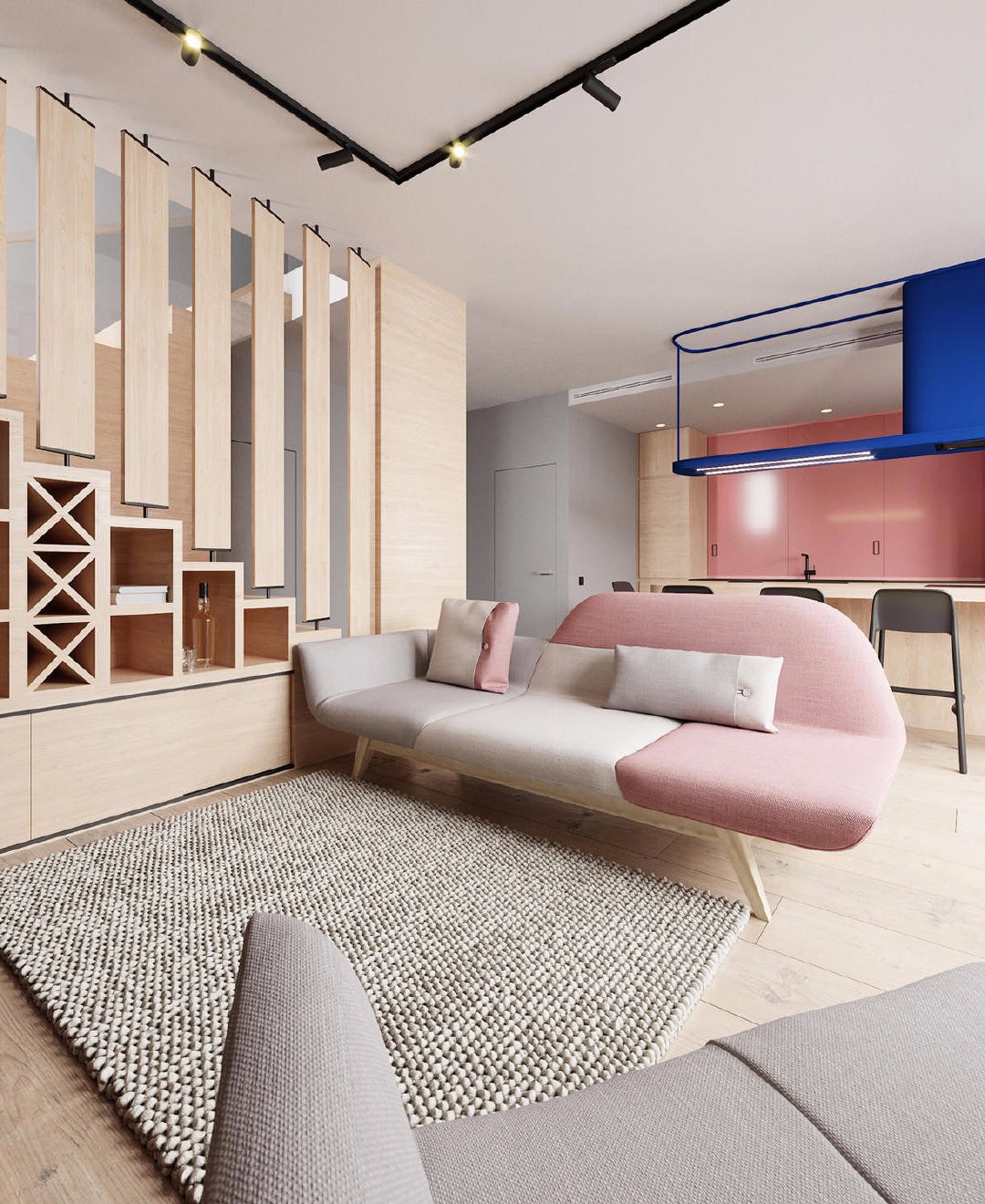 厨房空间粉色,原木色,黑色三种颜***撞在一起,显得厨房比较高档。