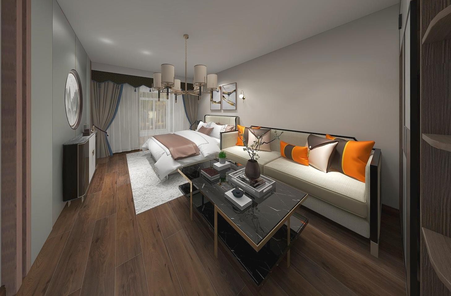 卧室整体采用木色与白色,加以中式背景墙,整体大气舒适