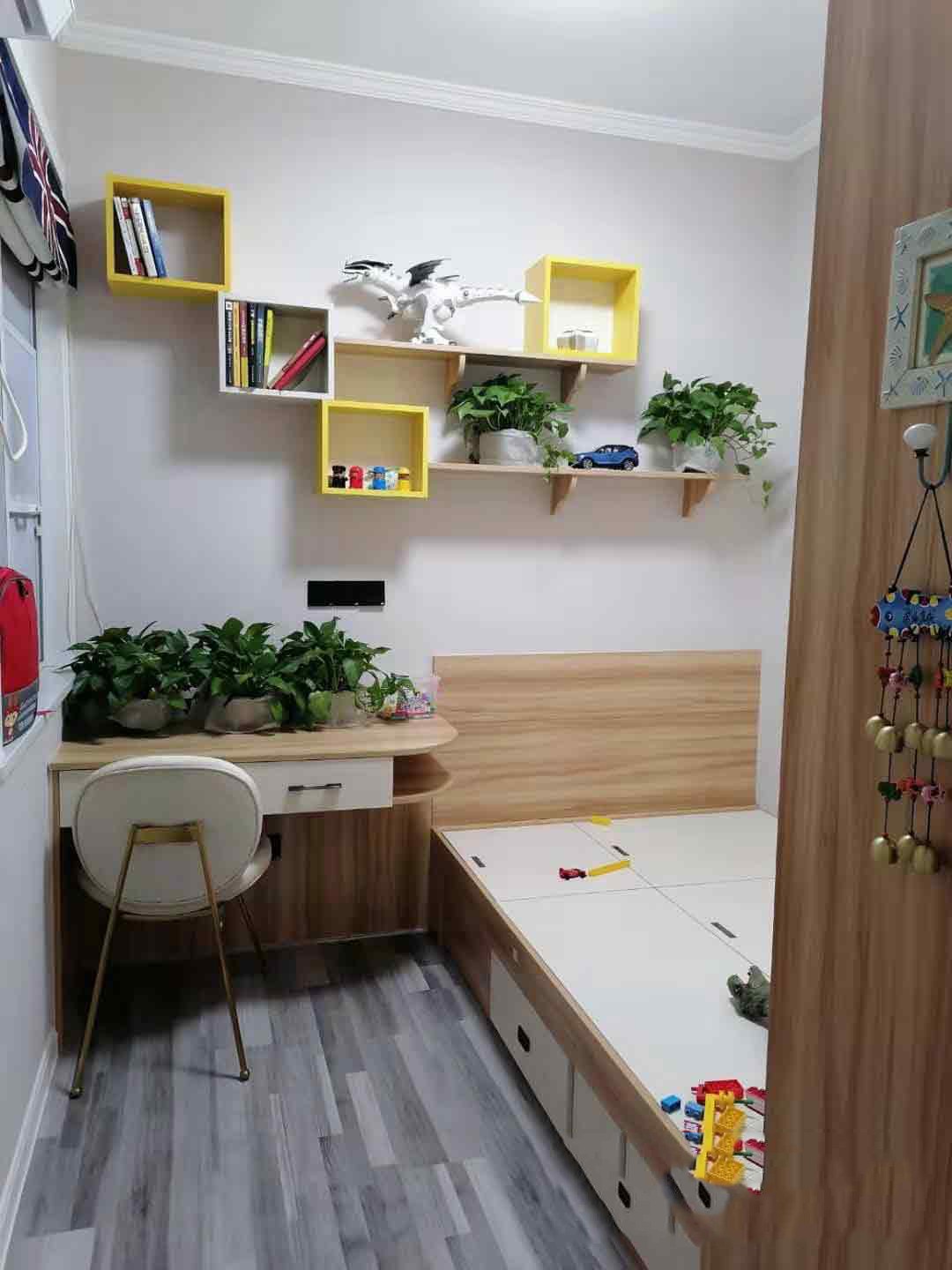 榻榻米,设计师大胆的运用了八种颜色组合设计,每一处设计都十分到位,八种颜色并没有显示出空间的混乱感,反而交相呼应,每一处都被爱与家诠释的淋漓尽致。