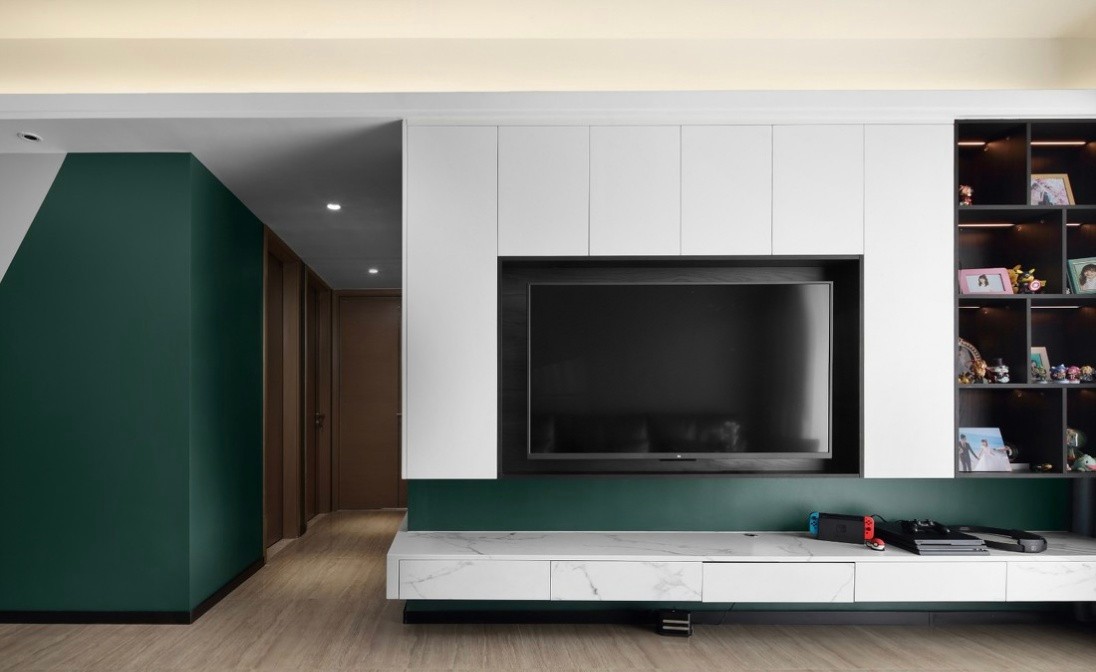 设计师采用大面积白色+局部墨绿点缀的做法,