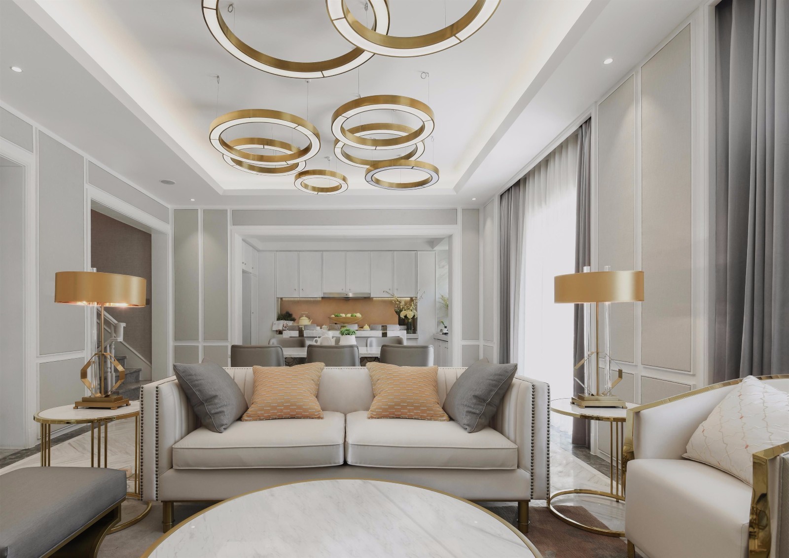 这是一套极简轻奢风,整体设计选择了中性色调的灰,搭配黄铜材质的灯具和摆件,牵引出浓浓的时尚高雅范