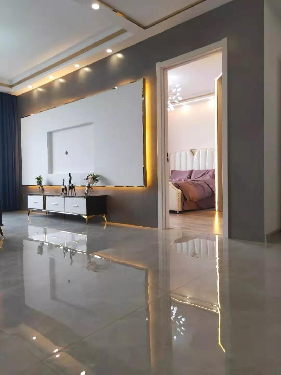 客厅背景墙,灰色是理石上墙