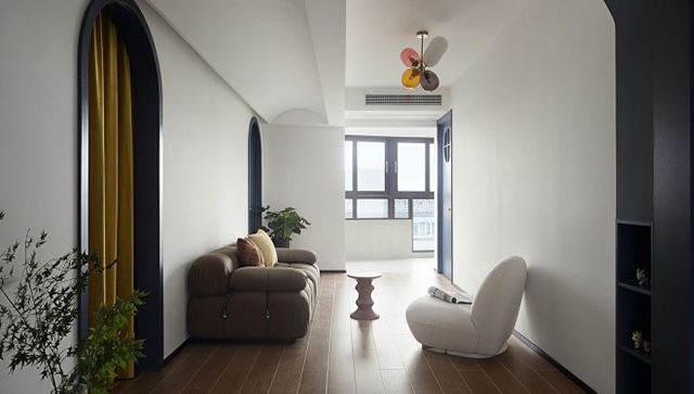 客厅打破了传统格局,造型上用不同的弧形元素,营造艺术气质感,简单柔软的沙发和圆润个性的单人位组合,让活动空间自由而纯粹。