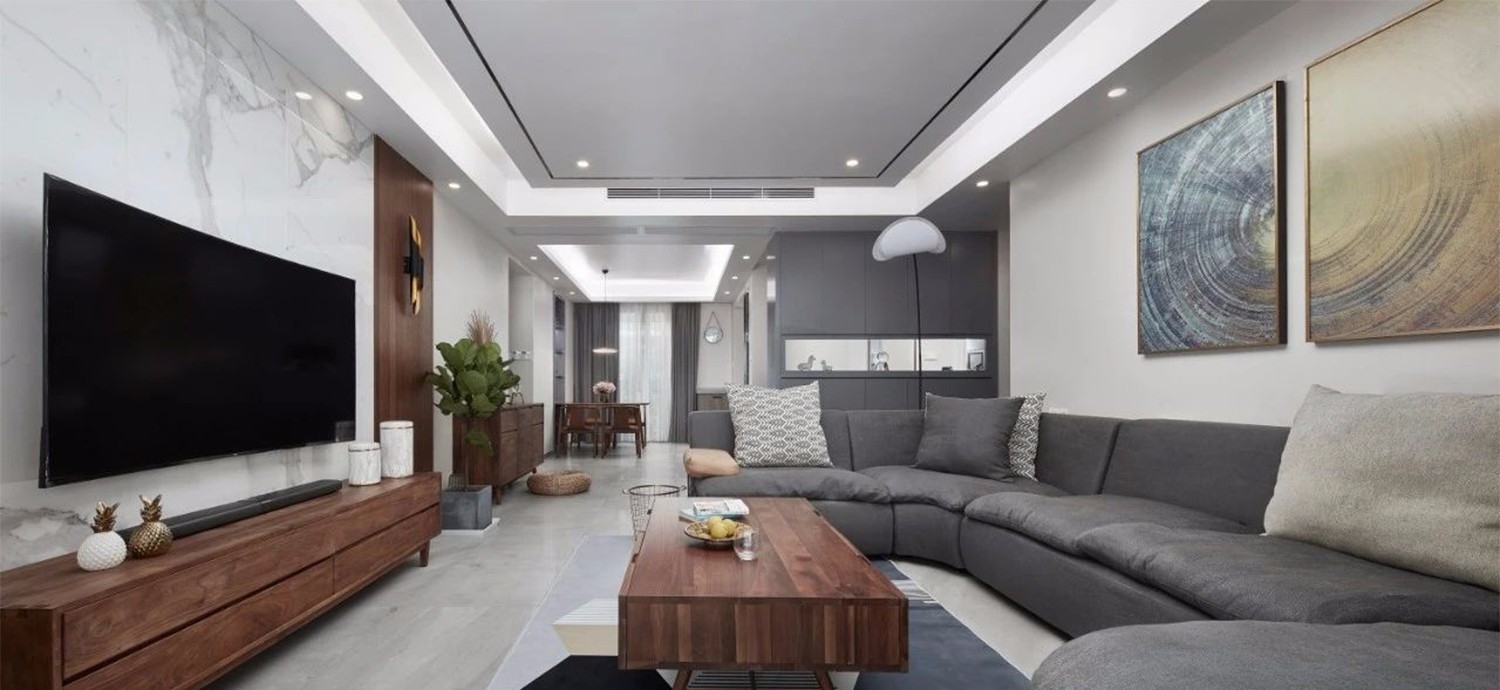 本案例是一套面积为160平米的现代简约风格三居,以灰色搭配黑胡桃木贯穿整个设计,低调沉稳,质朴不失品质感,体现的是一种质享灰调美学生活。