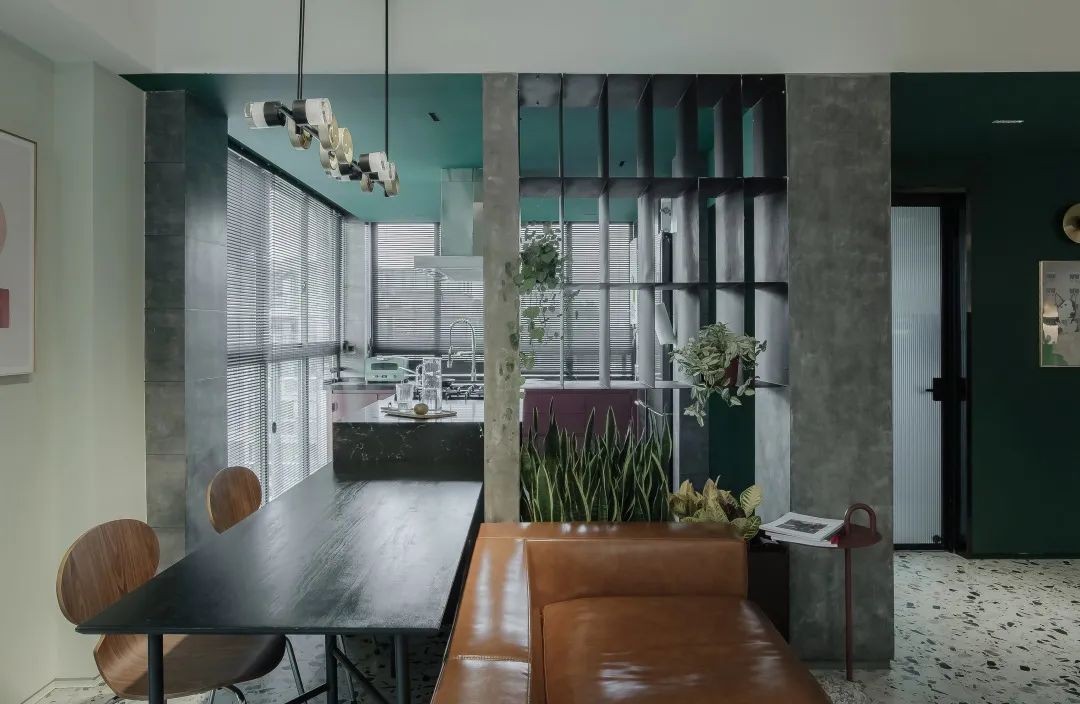 厨房和客餐厅之间设计了一个格子架,下面是绿植的种植槽,上半部分是悬浮的钢板搁架。选用钢板,一是材质视觉上比较轻盈,二是从支撑性和承重上来说,它的荷载也比较高,美观又实用,可以展示厨具、器皿、植物等等。