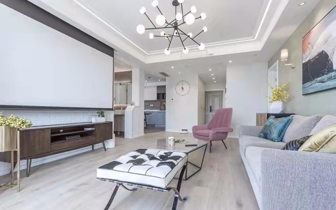 客厅整体浅色的搭配,让空间更显舒适,大气的幕布,现代感十足。