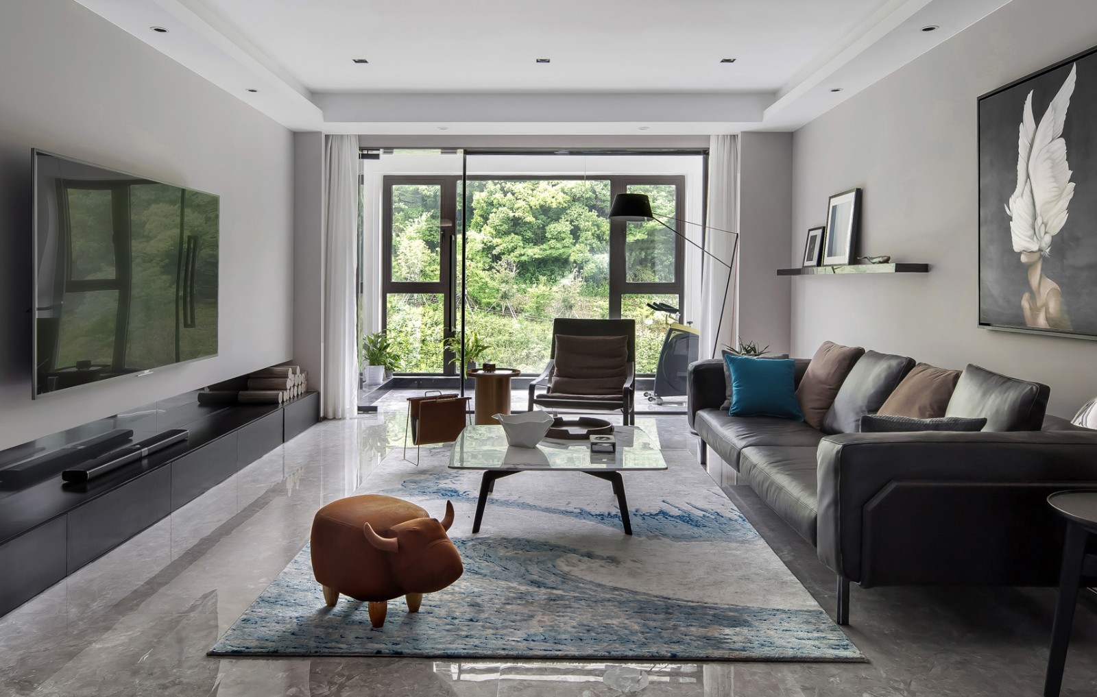 黑色电视收纳柜与褐色真皮沙发相对立,蓝白渲染浅绒地毯犹如蓝天白云,被滞留于足下,使空间不再单调,落地窗设计将户外大片景色贪婪地收入眼底。