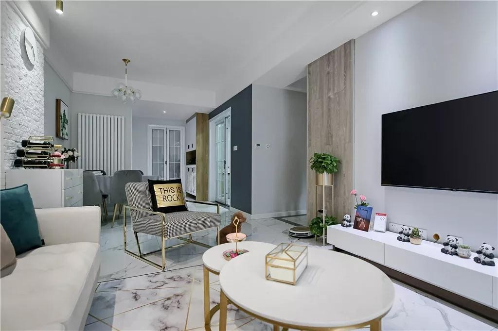 电视墙简洁的基础,在左侧加入一道木饰面的设计,搭配一个洁净的白色电视柜,布置上小饰品与绿植点缀,呈现出一个年轻舒适的北欧氛围。