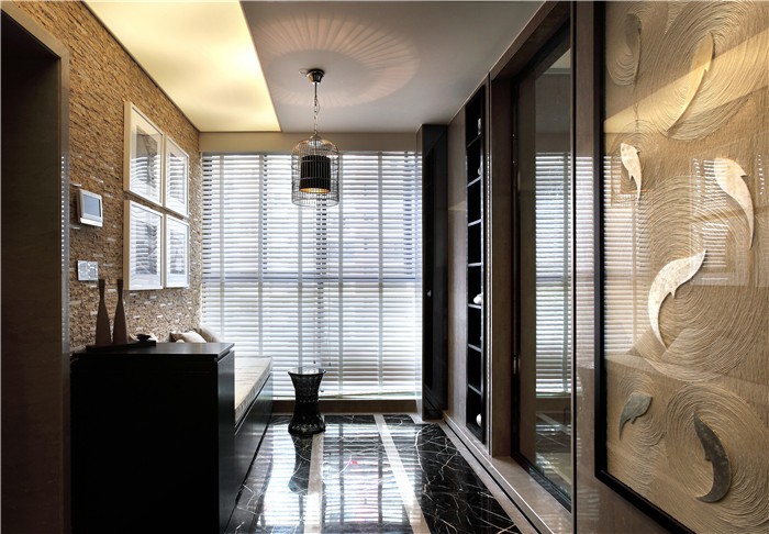 玄关是业主重金打造的,不仅有做旧的仿墙砖背景墙,也有一进门就能看到的金色锦鲤画像,让人一进门就能感受到精致奢华,展现业主对生活更高品质的追求