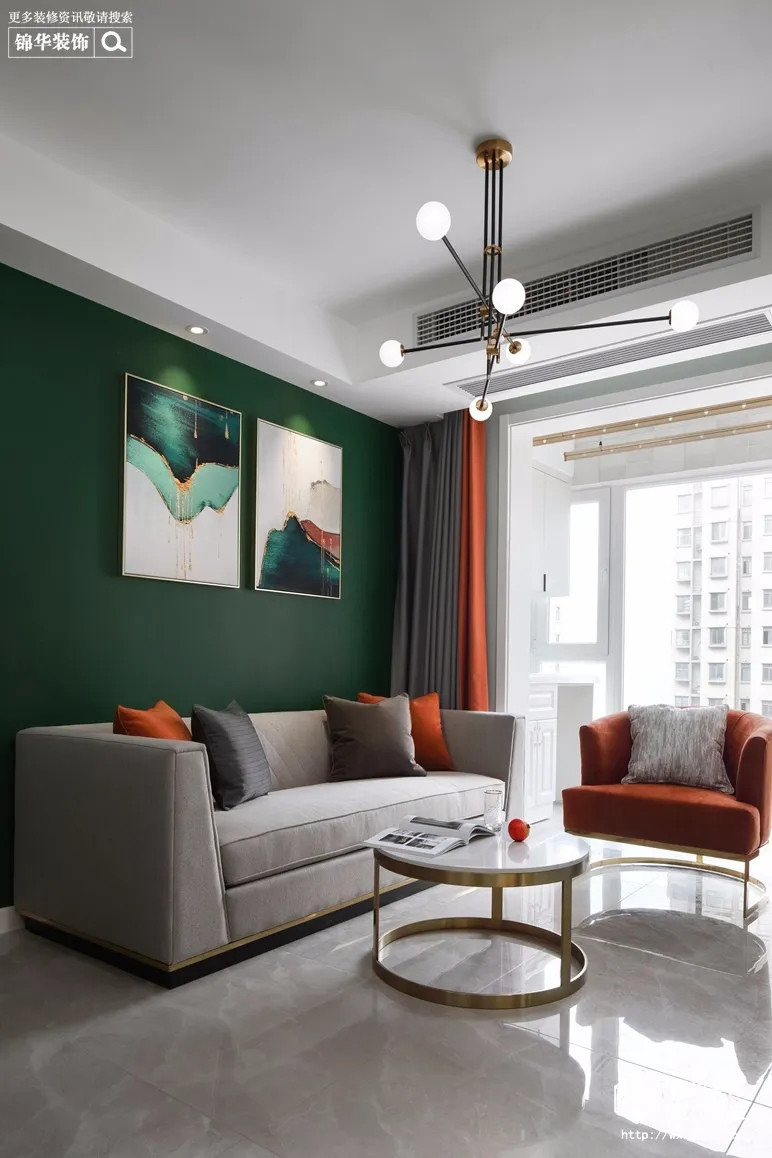 客厅沙发背景墙上采用墨绿色格调,与薄荷绿色的电视背景墙壁。
