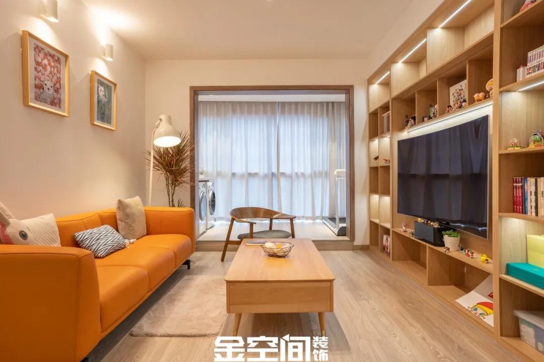 客厅通铺原木色的地板,一整面墙都使用高柜设计,将电视机融入其中,既能摆放心爱之物又能让它得到展示。结合爱马仕橙的皮艺三人沙发,这样不仅享受到舒适的坐席位置,还可以感受到自然舒适的原木风气息。