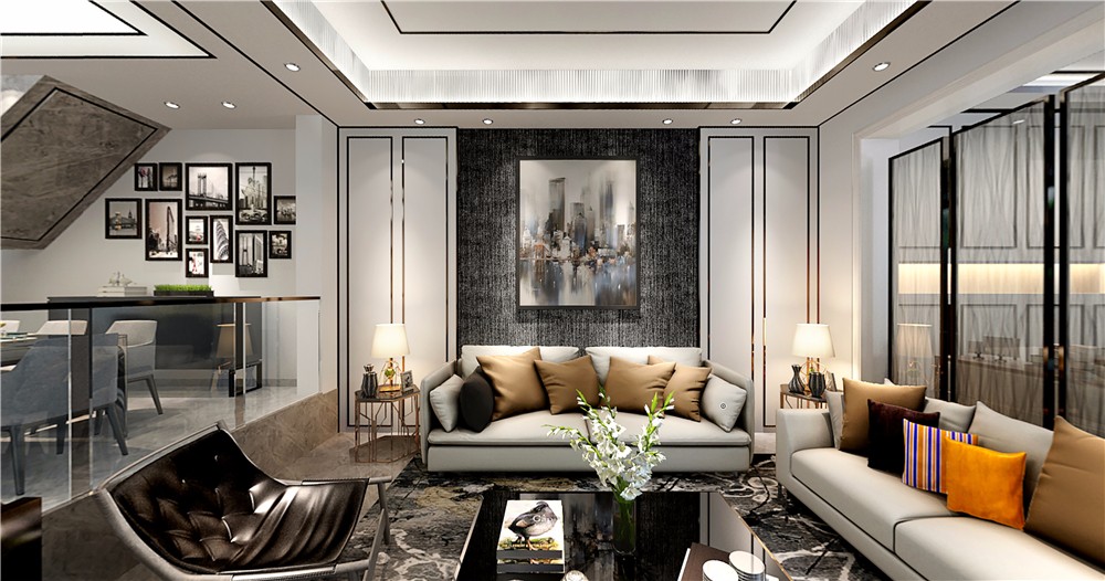 整个基调以黑白灰为主,艺术拉丝玻璃作为前厅与客厅的隔断,起到划分区域的同时增加时尚气息。
