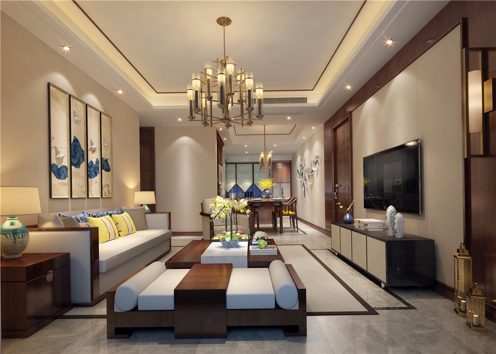 客厅采用新中式风格多用的实木为基本元素,抛弃华而不实的装修理念,小户型也可以做到去奢从简