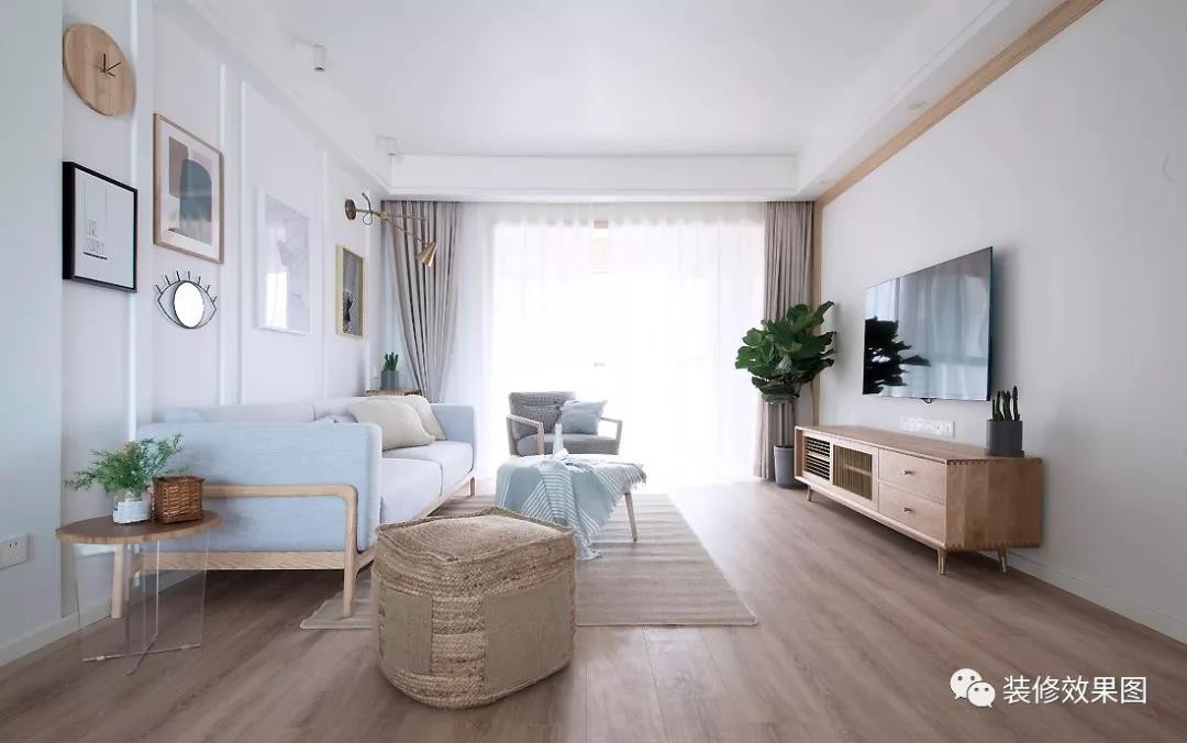 客厅从日式和北欧的干净简约出发,利用棉、麻及原木等天然材质,烘托出自然、轻松的氛围。