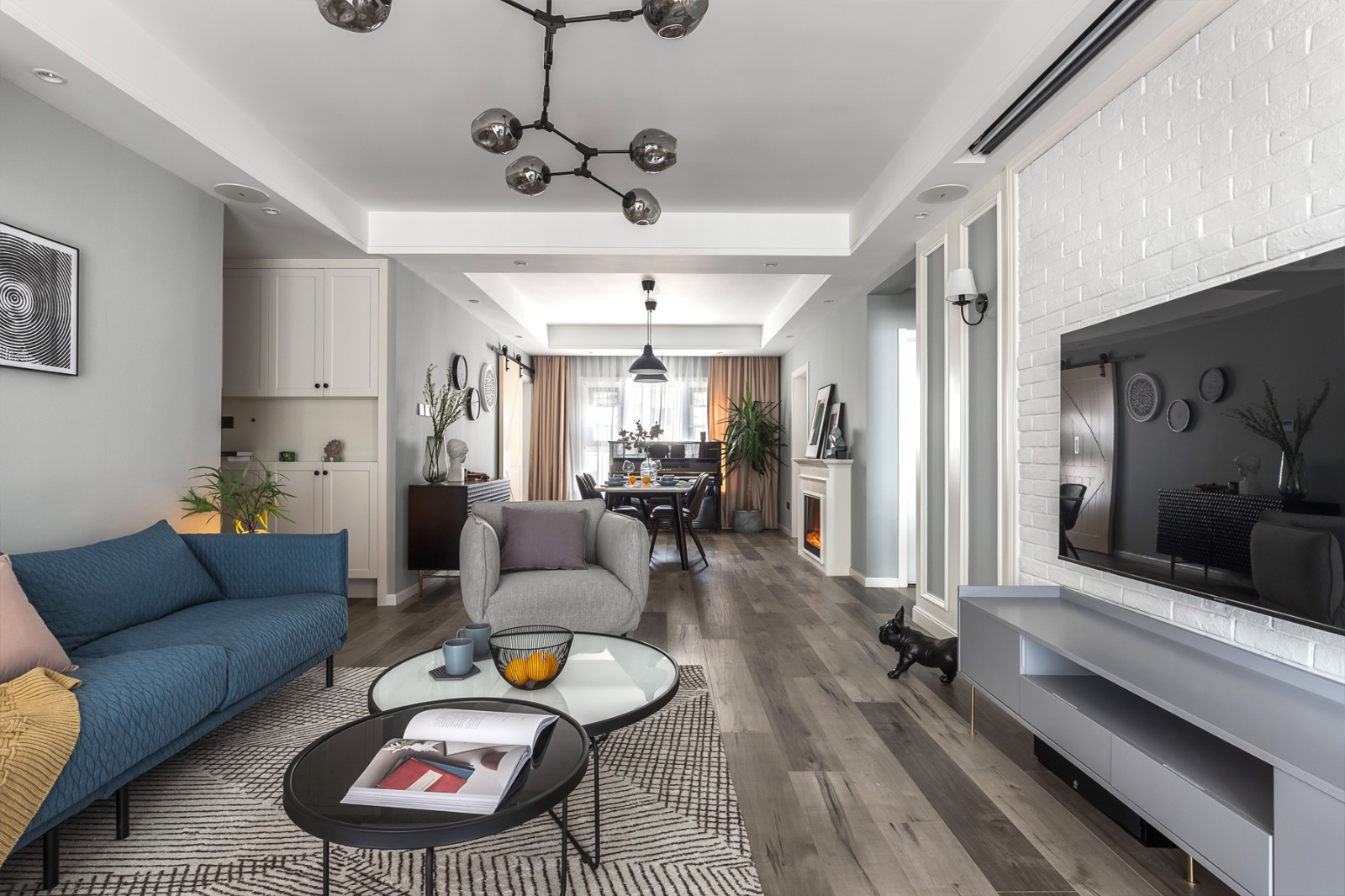 在客厅的设计上,设计师以内敛的灰色调打底,塑造出一个静谧安定的空间氛围。透过对软装家居材质的混搭,及初冬壁炉中的火焰缓缓的升起让给生活带来更多的仪式,使整个空间精致而不张扬,沉谧简宁的氛围。