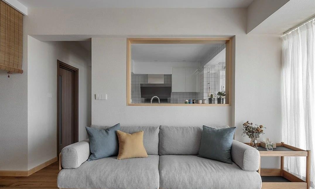 客厅,大大的落地窗带来良好的采光,与白色的空间主调一起,共同营造敞亮明净的生活氛围。 客厅和厨房之间的墙上设计了一面玻璃窗,既增加了空间的互动感,让家更有趣,又确保了通透性,引入了自然光。