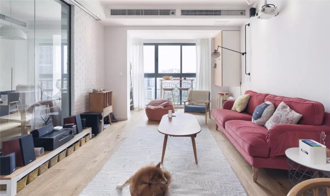 客厅没有摆放电视,用隐形的投影幕布代替,玻璃加上文化砖做得电视背景墙,让空间更加通透、明亮,粉色的沙发和懒人沙发增添了一些可爱、浪漫感