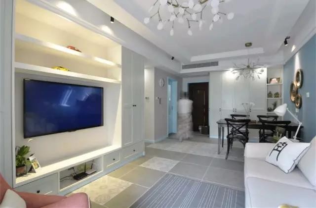 同时也没有电视柜,准确点来说电视柜已经藏在墙体里面了,即直接做成一个大的收纳柜电视墙,两边做成带门高柜,中间则是矮柜兼电视柜,上面还做了层板,这***是集实用于美观为一身的电视墙,然而对于小户型来说,这样的电视墙最合适不过了;