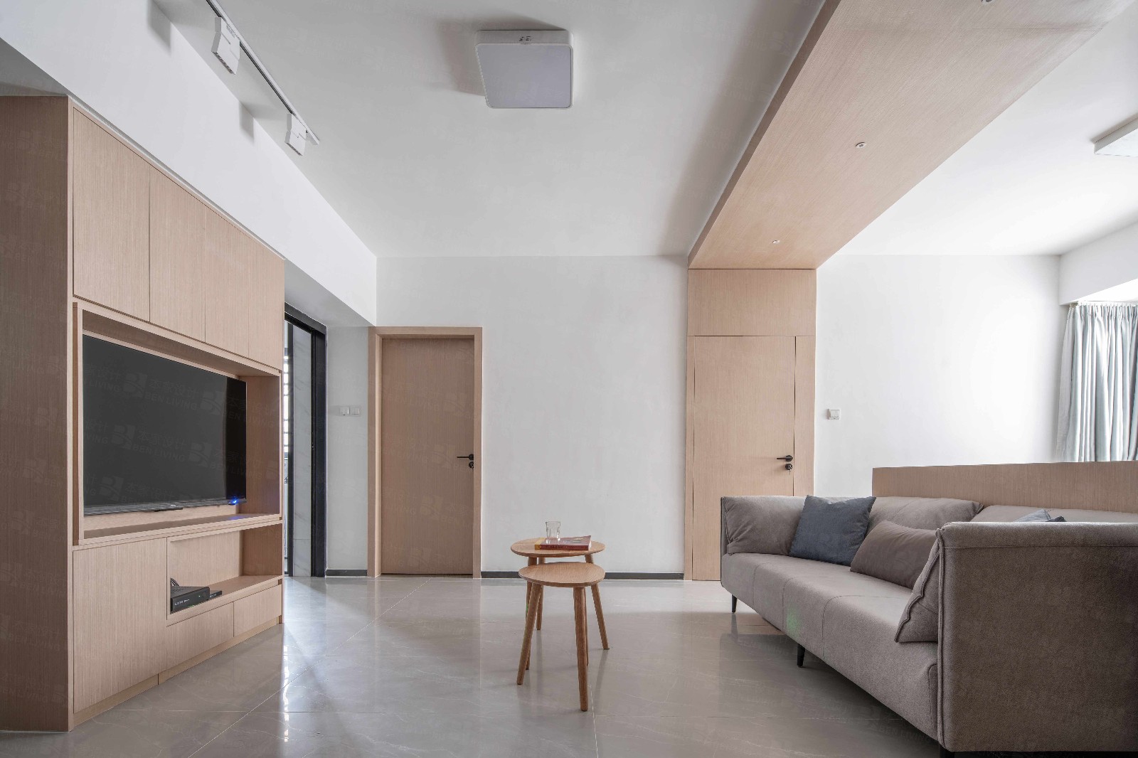 屋***望能有一个与孩子做运动的地方,增进彼此之间的感情。所以在沙发的背后,设计师将这一块作为家人的休闲娱乐区。采用木质地板抬高,减少人在光脚走路时冰凉的感觉,与整体风格保持一致。沿着活动区的墙体,定制了1800mm的收纳柜,作为全家公共的收纳空间。