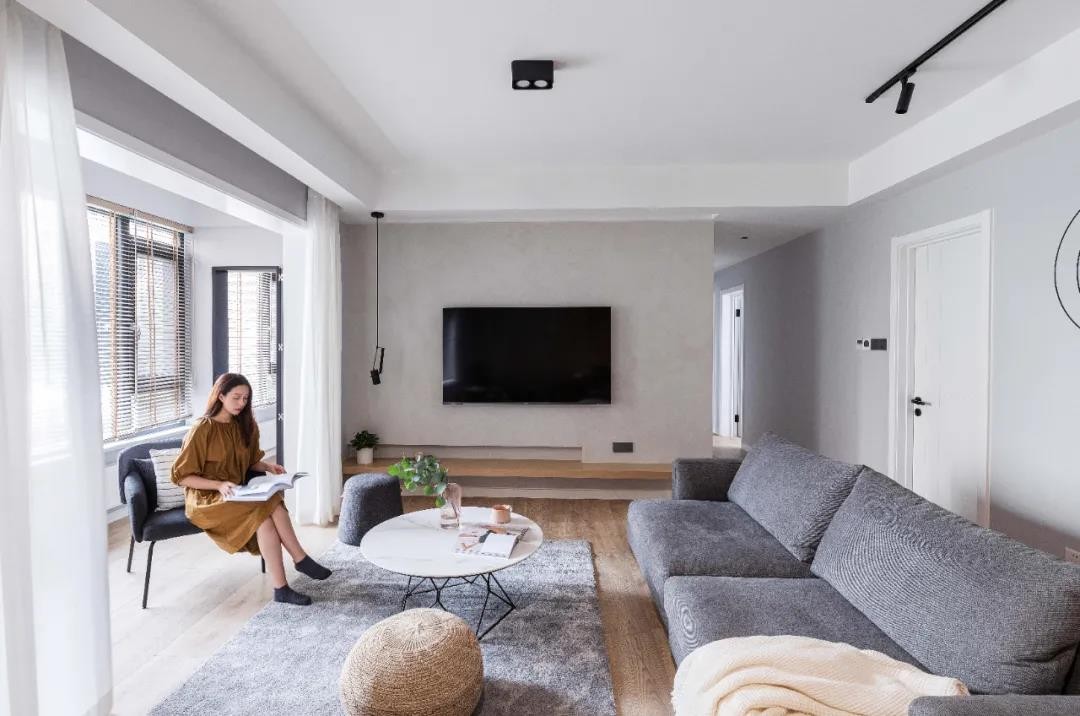客厅采用无主灯设计,一盏悬垂吊灯+轨道射灯,满足不同场景的照明需求。