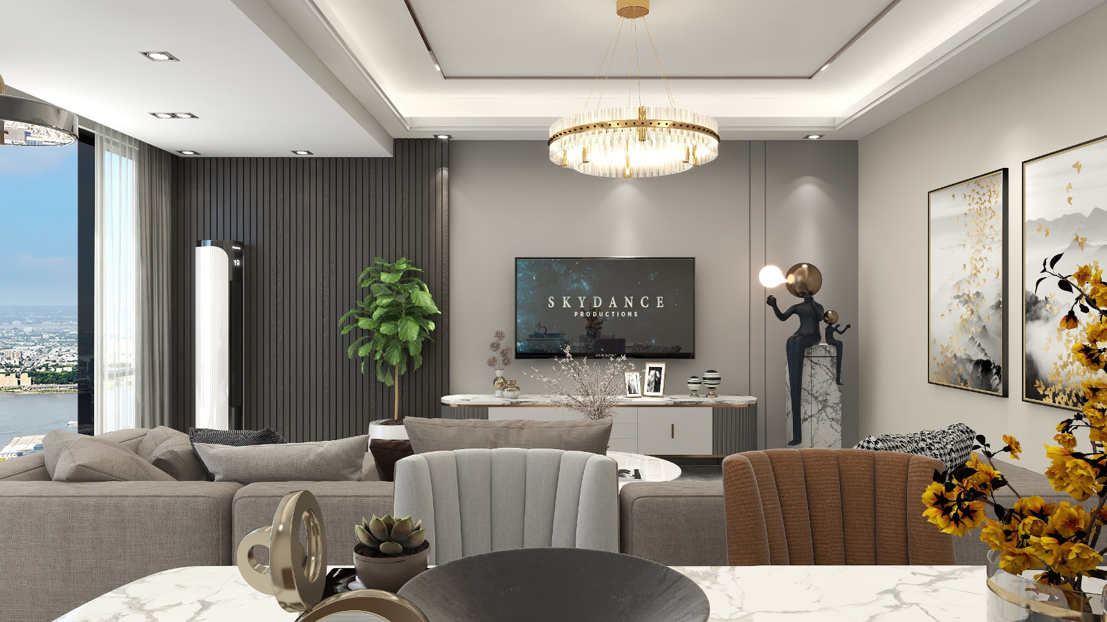 客厅灰色墙面+木质栅栏 很有层次感