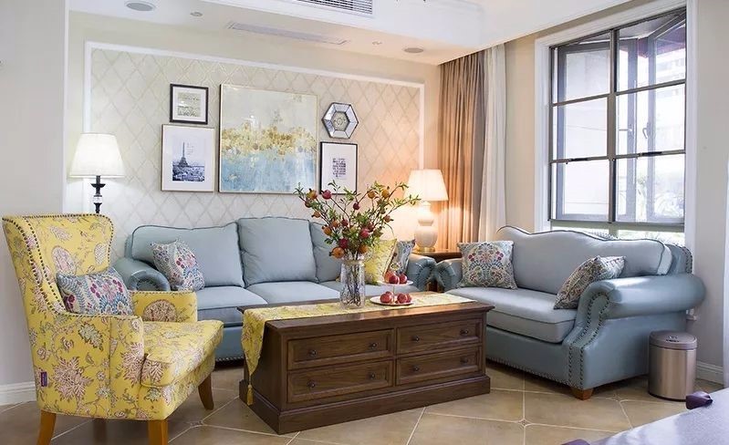 客厅是浓浓的美式田园风,浅蓝色,暖黄色,还有碎花元素,搭配在一起,给人的感觉非常安静、温馨。壁纸,黄色的单人沙发,防滑地砖。墙面的多种材料处理手法,让空间简洁又具有层次。