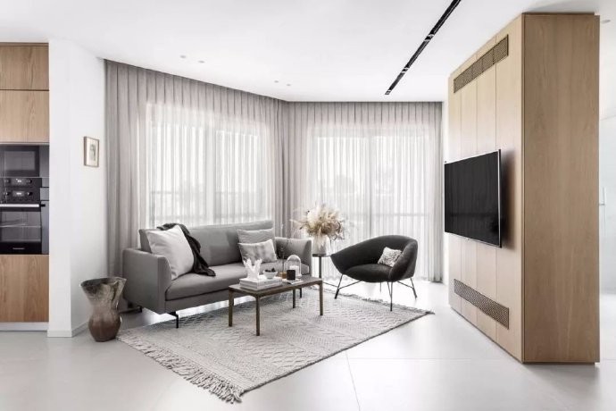 浅灰色的沙发质地细腻 配上棕色的扶手椅 摩卡色的咖啡桌和米色羊毛地毯 客厅设计的很有意境 利用橡木柜做电视背景墙 将电视和储物单元整合在一起 既节省空间又有较多的收纳 用网眼织物制成的窗帘 定义了起居空间极其沉静氛围感