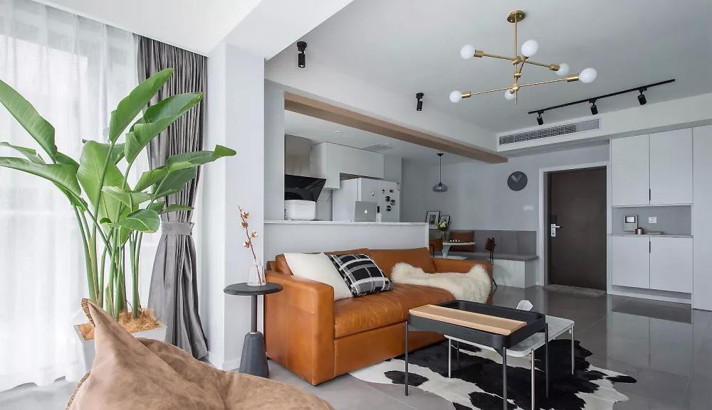 客厅处将厨房这面墙敲掉,用吧台作隔断,阳台内包,原本规整局促的客厅就开阔了许多。