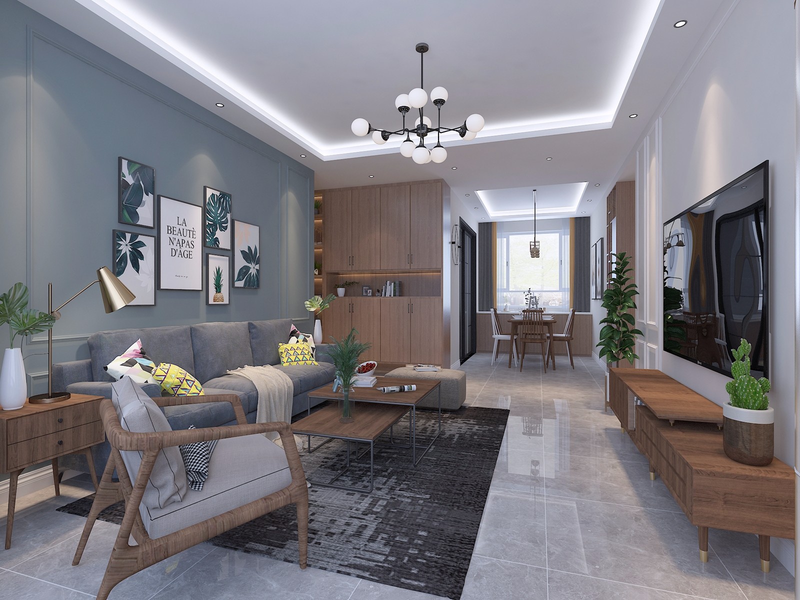 客厅:深色地毯的搭配让整个客厅脱颖而出,简约大方的灰色地砖,布艺的沙发和几款尖腿家具简约而时尚,搭配上显眼的绿色植物和墙面的线条设计让整个客厅呈现出一种生机勃勃的自然美。