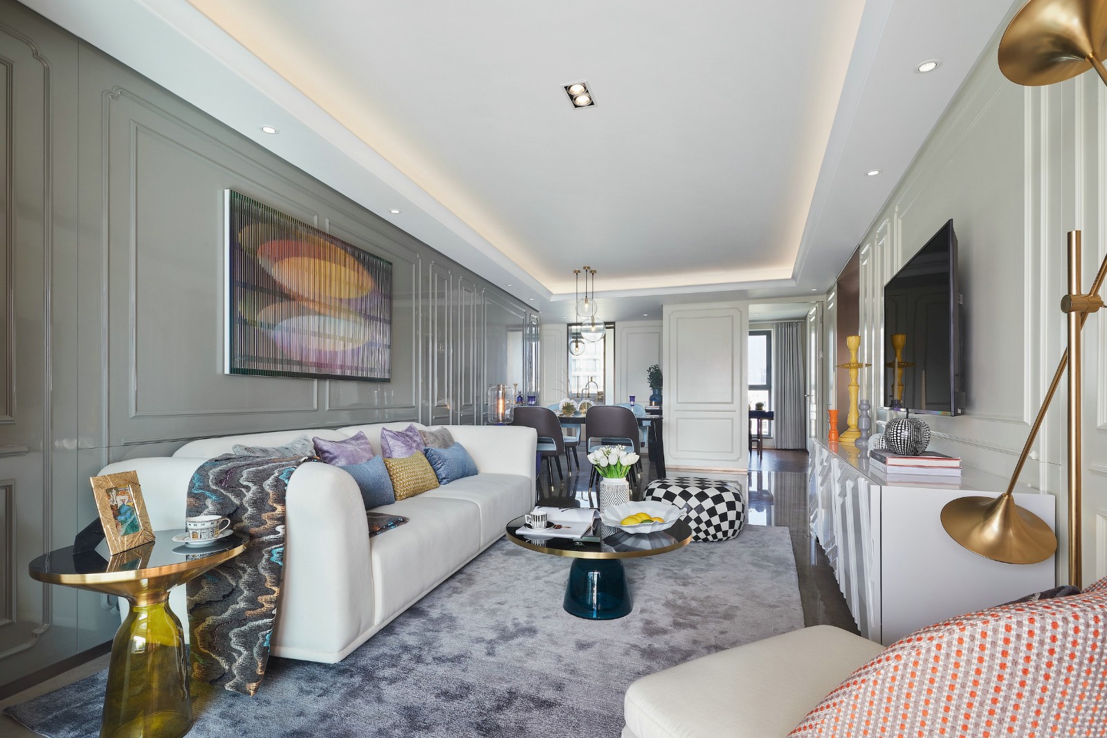 满载缤纷色调,充满活力造型的家私排布其中,显得广阔而惬意,整个设计亦因立烤漆面板上的简单条纹而生色不少