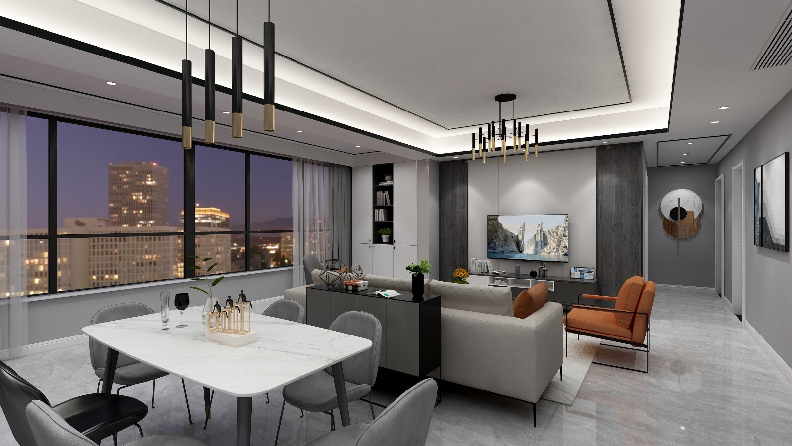 客餐厅大气横厅设计,这是完工实景照片,效果和设计图一致。