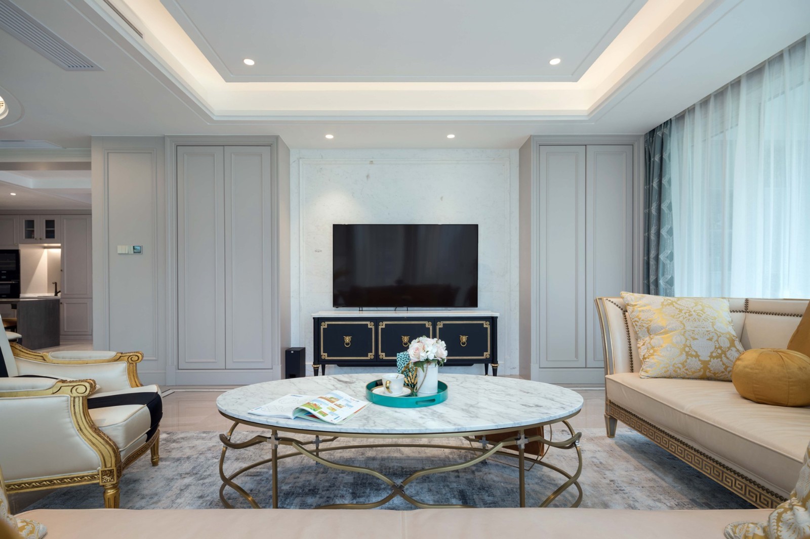 餐厅及厨房运用黑白灰调,配以黑白轻奢餐桌椅,冷酷而不失时尚感,当五颜六色的食物摆满桌面,那人间的“烟火”才脱颖而出,使其更有食欲。