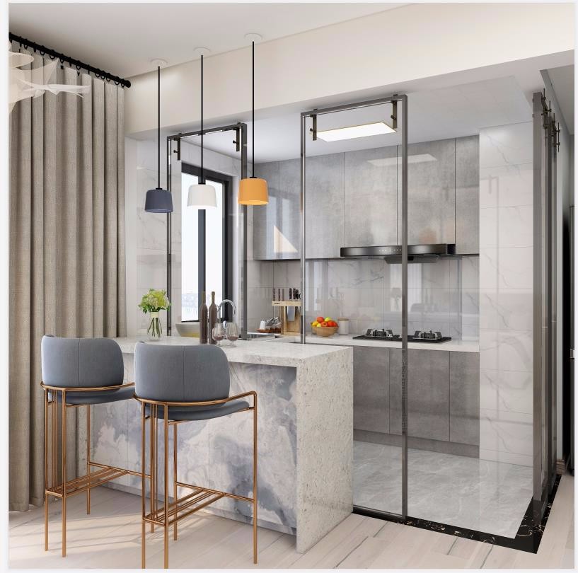 开放式厨房,吧台,上轨道推拉门