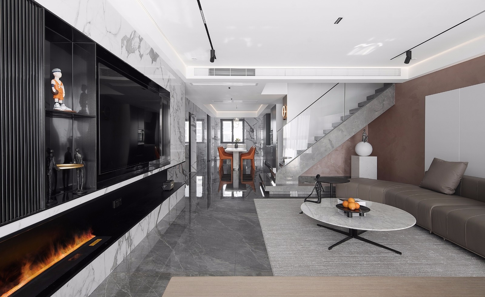 黑色的纹理大理石延展到空间的角角落落,奠定了空间沉稳内敛的底色。浅咖色的皮质沙发与木质、柔软的布艺地毯相互碰撞,让空间提升了空间质感和细节感。白色的边几与大理石圆桌布置个性创意的小饰品,也让空间显得更加舒适而有趣。