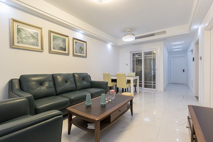 电视的背景墙搭配着,墨绿色的沙发、成为整个客厅空间的主要配色。爵士白防大理石的地砖、搭配着茶几、沙发。在色彩上整体统一。