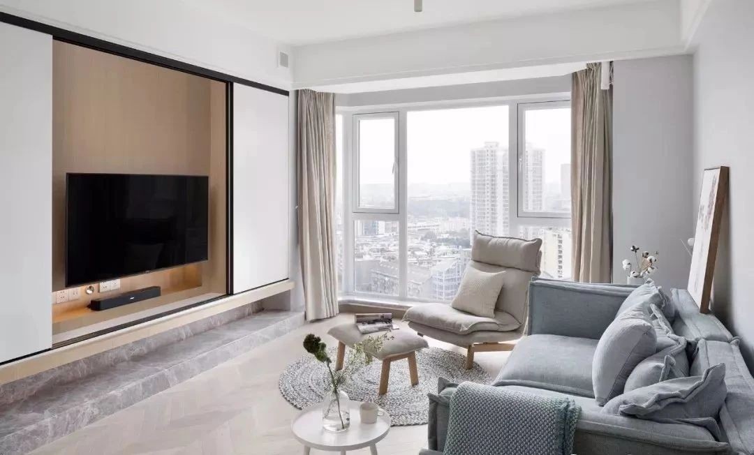 电视墙做了移门,可以把电视隐藏起来,这设计真的太赞了!另外,底部设计成悬空柜,可当成展示柜来用。