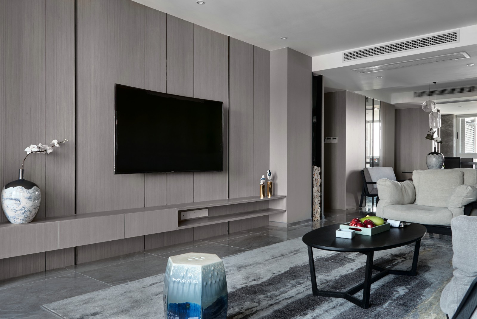 客厅以小方桌来当作茶机,整体配色简单,黑白灰黄,而电视墙则以壁柜的 形式来表达,完全可以把客厅当作书桌来使用。