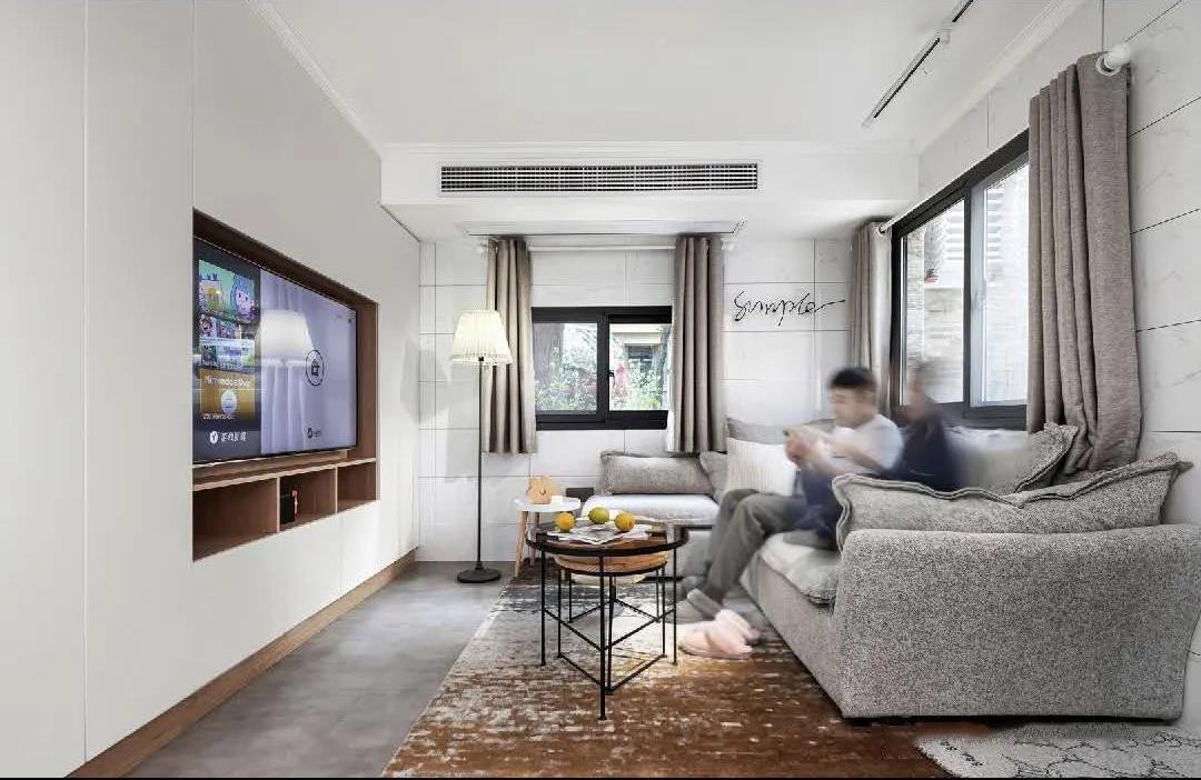客厅采用无主灯设计,整体利用轨道灯、落地灯配合不同的光源需要,
