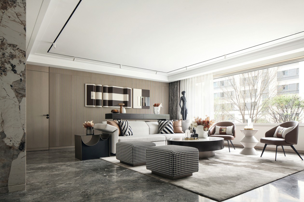 雾面玻璃与线性元素的结合,将实相与虚相交错,理性与感性的交融间,新时代摩登绅士风范品质生活跃于眼前,规律的折线元素在流动的光影中静谧温婉,宁静有度。