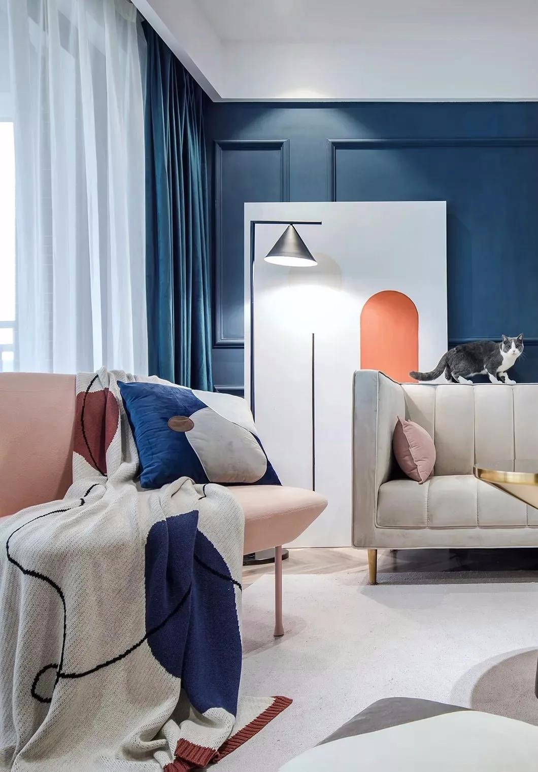 ▲客厅空间的配色大胆优雅,粉色的电视墙与深蓝色的沙发墙,大胆的对比色调相互撞击,带来了一种优雅的高档与时尚气质,现代简约的家居布置,也显得更加轻松舒适。沙发墙在深蓝色的基础,加入边框造型,布置优雅舒适的布艺沙发,也呈现出一种闲适轻松的居住体验。