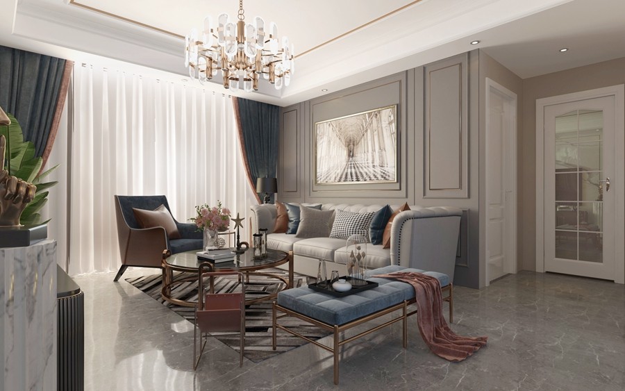 客厅地面采用瓷砖设计,提高整个空间的亮度。客厅区域采用了亮面石材与灰色木质的护墙板相结合的设计,在大理石与护墙板设计中加入了弧线的设计,使空间更有层次感。