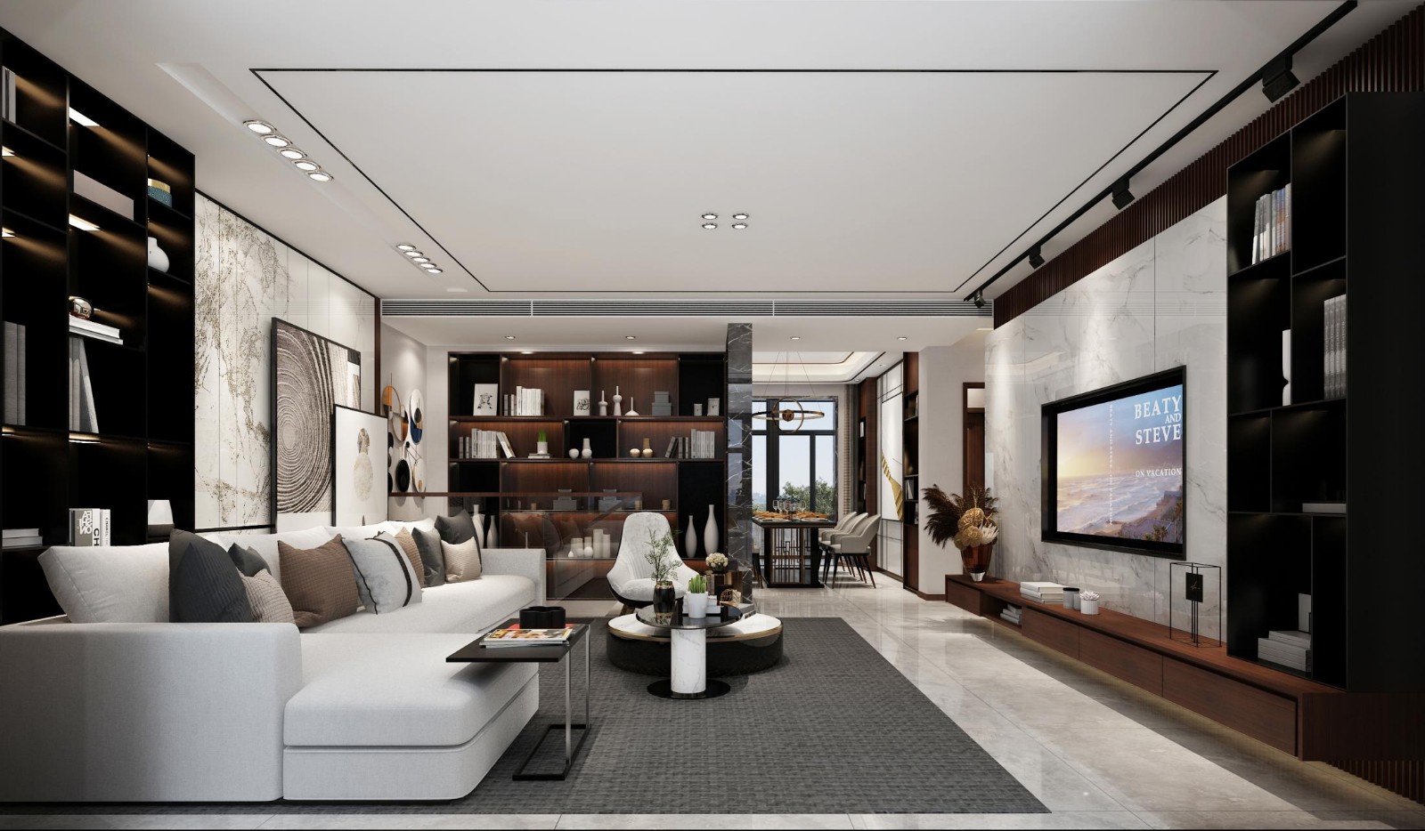 客厅设计中,应用天然石材及木色作为主色调,大面积平顶与黑色条形射灯的结合给人带来大气、高贵、前卫、不受拘束的感觉。