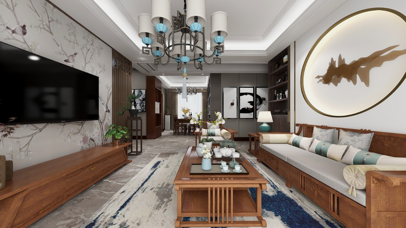 采用了新中式的设计效果,三室两厅两卫一厨。