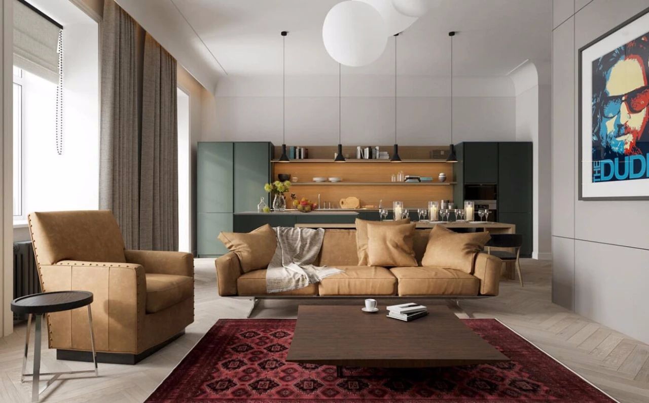 使用了红色的地毯提升整个空间的饱和度,并以森林绿的柜体进行鲜明的对比。