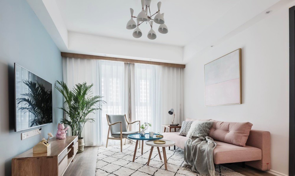 布艺沙发选择了不张扬的烟粉色,搭配灰色系抱枕和搭毯,与墙面挂画色调相呼应,让空间收获满满 的***感。